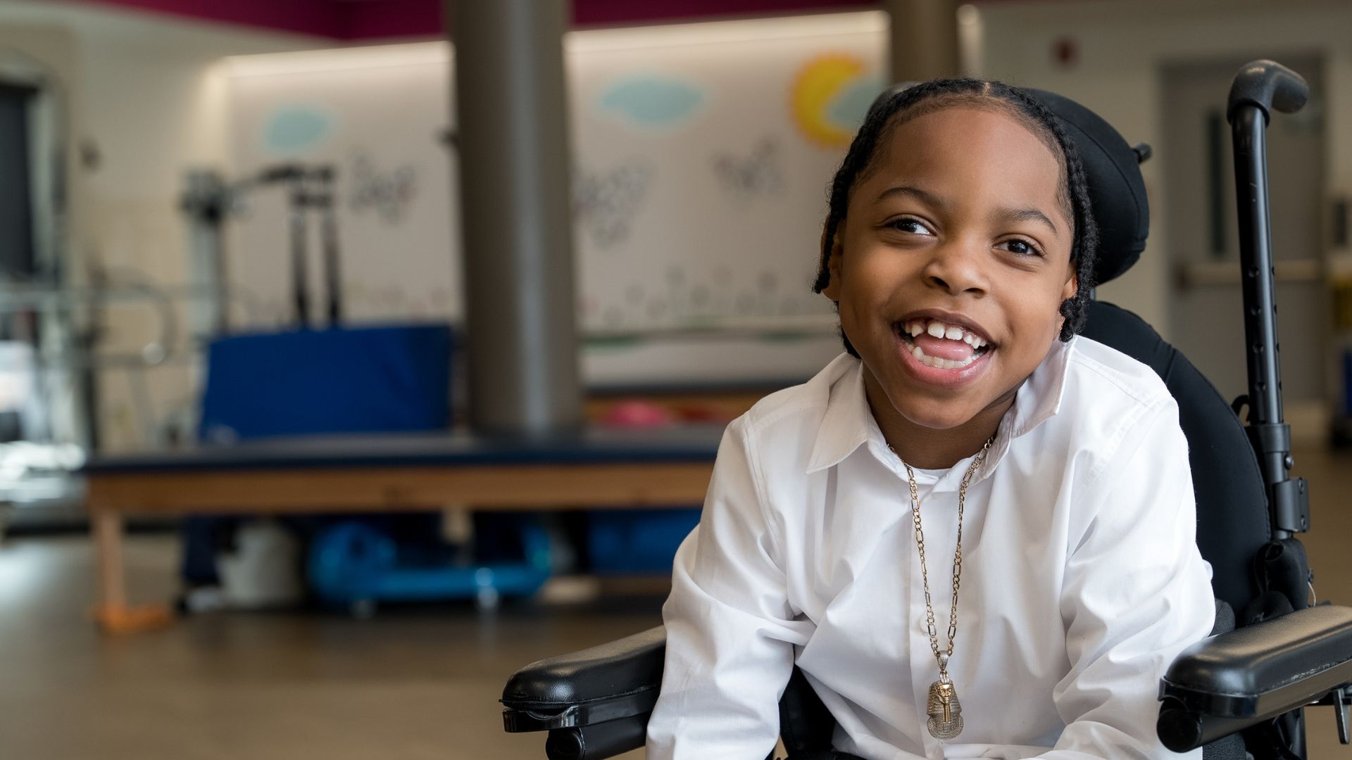 What Josiah is learning in therapy shows up in meaningful, everyday ways. He learned to sit up independently, kneel on his own, and improve his balance and body control. One unforgettable moment for his family was watching Josiah walk in his gait trainer, happily saying hi to everyone he passed. Each achievement builds his confidence, and he loves sharing what he’s learned with his therapists and then again at home.